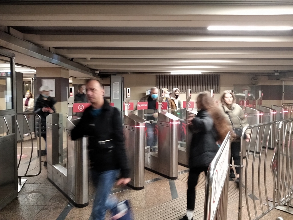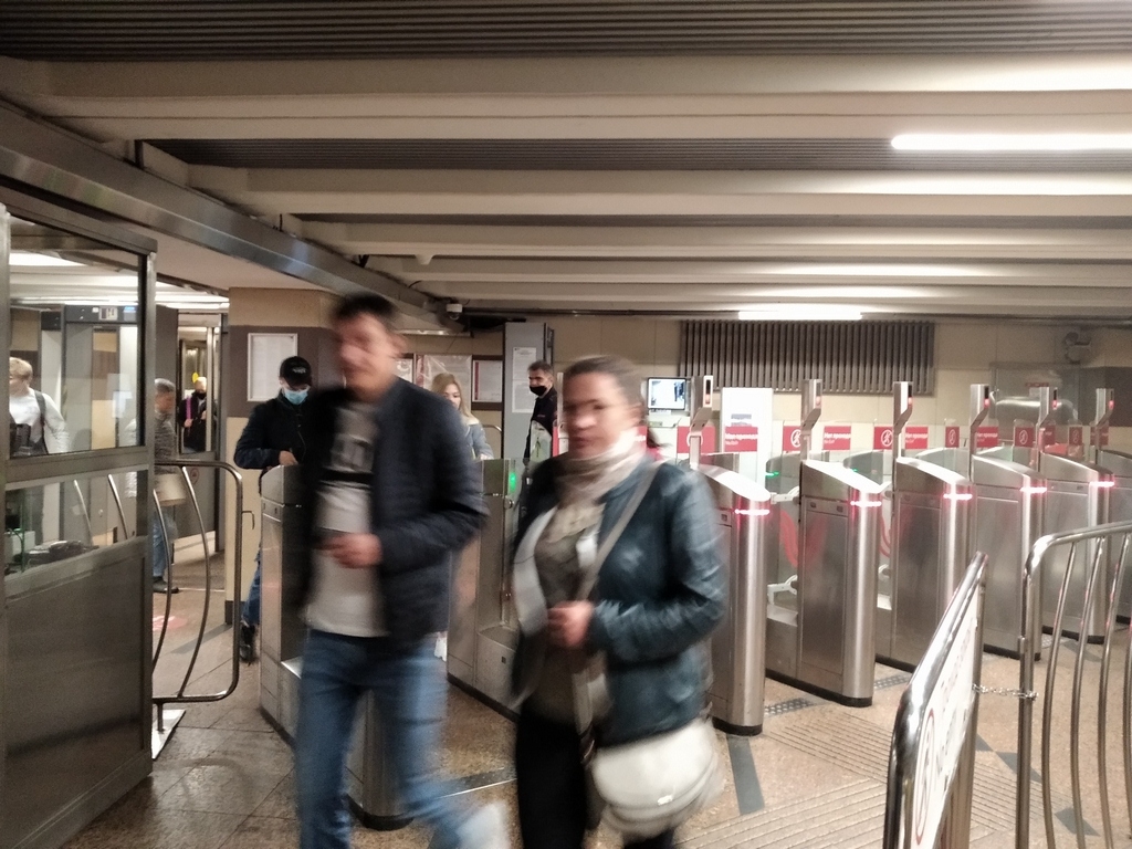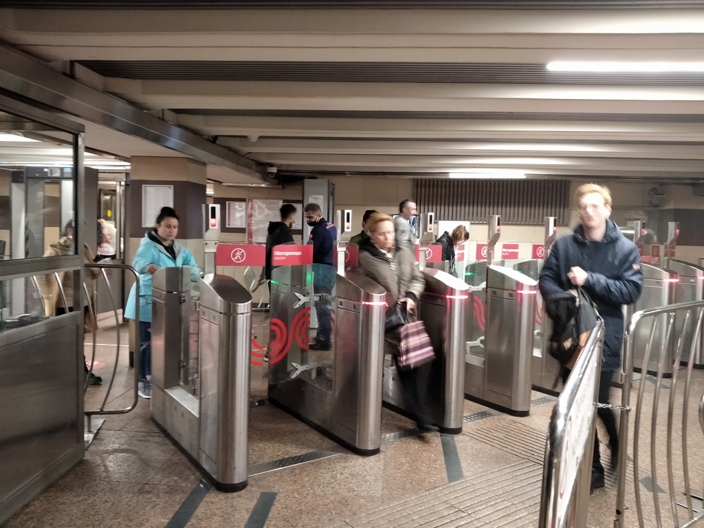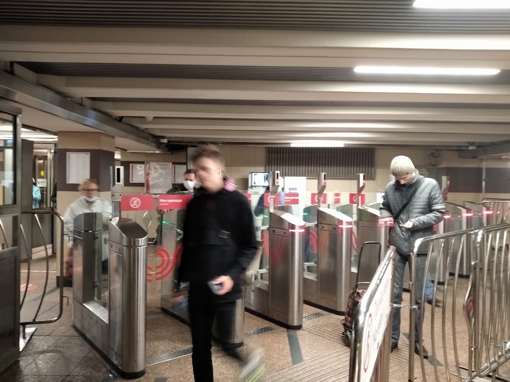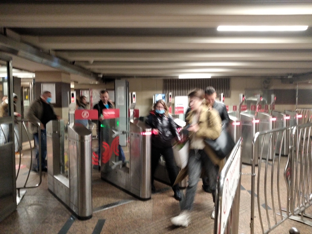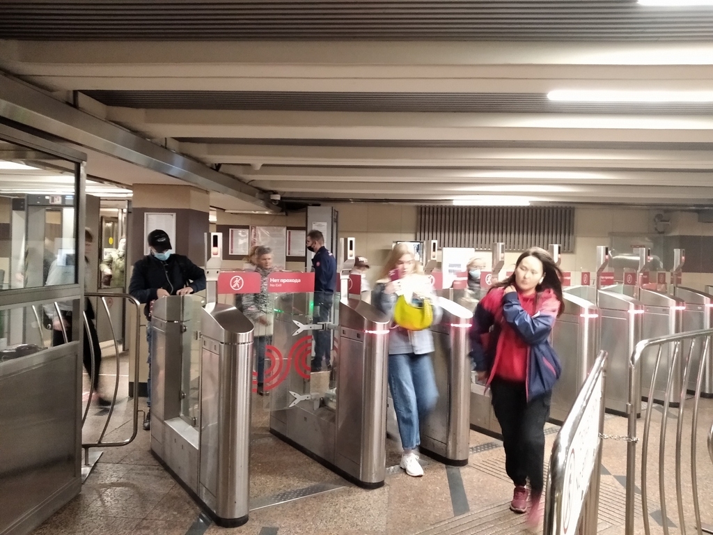 Вот, собственно, казалось бы и вся история. Однако, не совсем так. А если точнее – то совсем не так. В очередной раз был выявлен отвратительный факт дискриминации людей по национальному признаку. Впоследствии Айка по телефону рассказала мне, что буквально за несколько минут до моего появления в полицейскую подсобку увели таджика, у которого тоже не было маски, да еще обнаружили какие-то проблемы с документами, предварительно выписав штраф в те же 5000 рублей за отсутствие маски. Обратите внимание на сделанные снимки: практически все люди, проходящие через турникет метро «Кузьминки» - без маски. И я был без маски! Но никто не меня, ни их не остановил, и тем более – не оштрафовал. «Под раздачу» попали лишь таджик с неизвестным мне именем, и кыргызская девушка Айка, для которой «масочно-перчаточный» режим за время работы в продуктовом магазине «Билла» стал униформой, и которой просто не дали возможности приобрести и надеть маску взамен испорченной.